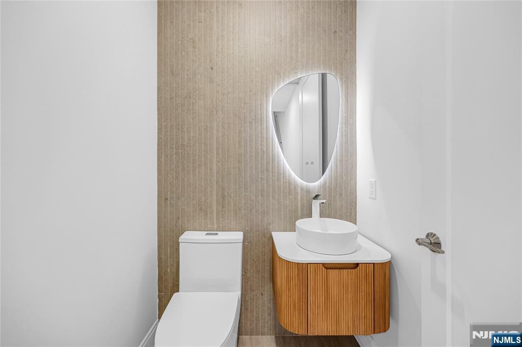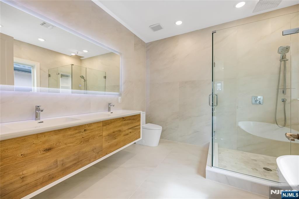 Welcome to the Eastside of the Palisades! Professionally landscaped W/Rooftop Views of a breathing taking skyline. Top of the line construction condo/townhouse, Large kitchen offering Stainless Steel BOSCH Appliances oven is WIFI, Quartz countertops with a center island, with access to a balcony made of TREX DECK, Walk through the beautiful White OAK floors to the dining room and living room with a fireplace and a 1/2 bath. The second level where you will meet a primary bathroom with spa like features A soaking tub, separate shower double sink all GROHN and Swiss Madison hardware, Hansgrohe mirrors, and tiled for a clean look, there are 2 additional bedrooms and a full bath with beautiful finishes, Electrolux Washer/Dryer and NuTone central Vacuum system. Run up to the loft that features a half bath and opens up to the roof top for entertaining.. The ground level includes a family room, a bedroom/den with a full bath great for an in law suite or nanny. All custom closets through out. this place you will soon call home has additional features 2 car garage with additional 2 outdoor spaces. Approx. 3300sqft of living space. 9FT Ceilings, one block to NYC transportation, Shops, many restaurants with of a variety of cuisines, Quaint coffee and bakery shops, personal care salons, and a medical center. Parks, schools, and house of worship through-out the town. Very family oriented with many seasonal activities . Come to your new home town of Cliffside Park.